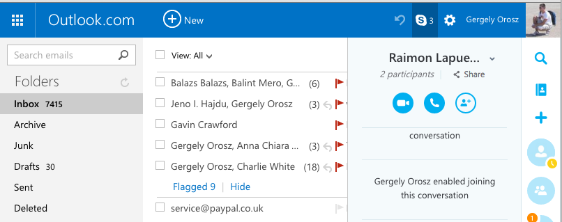 Szóval az egész onnan indult, hogy a csapatom integrálta a Skype-ot az Outlook.com-ba. Ez akkoriban volt, amikor a Microsoft megölte a Hotmail.com-ot, és mindenkit átirányítottak az Outlook-ra. Őszintén szólva pofásan megcsinálták az Outlook.com-ot, mi pedig pofásan integráltuk a Skype-ot, a jobb oldali sávba. Így nézett ki akkoriban: