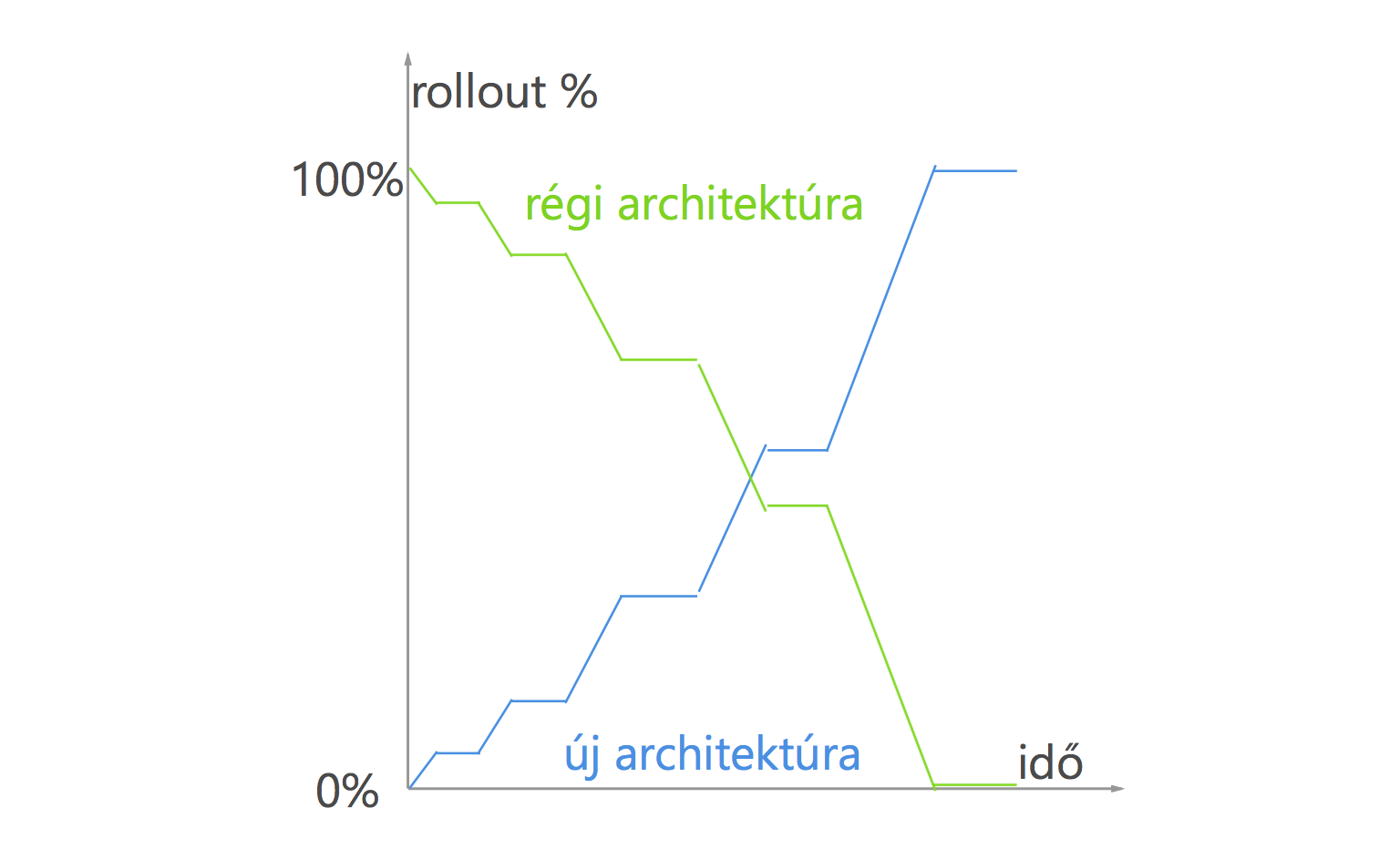 Az átállás pedig valahogy így nézett volna ki. A tervünk az volt, hogy két és fél hét alatt átlállunk az új architektúrára.